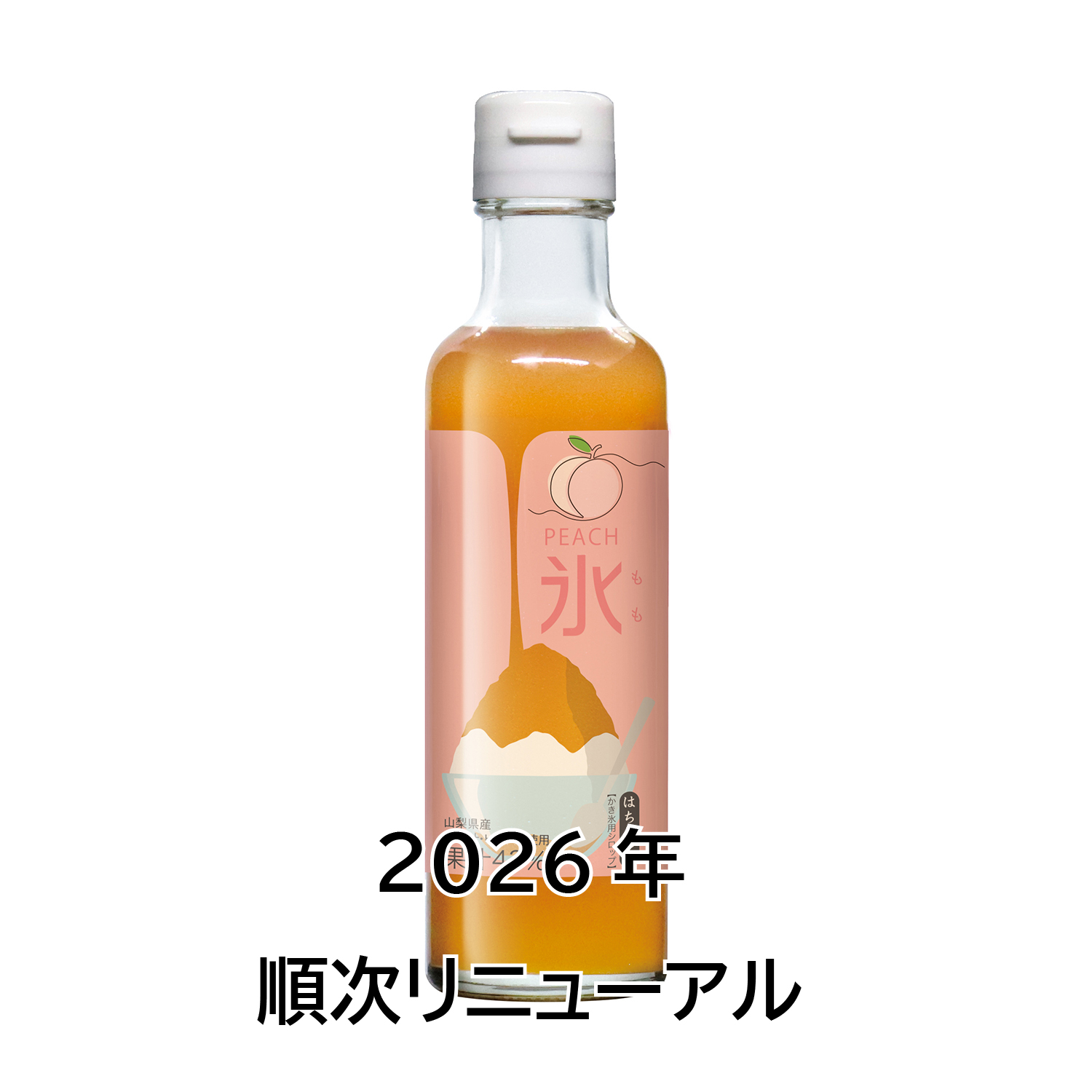 山梨県産もも果汁・ピューレと蜂蜜を使用したかき氷シロップ。果汁分が43%なのでももの風味豊かなかき氷がお楽しみいただけます
