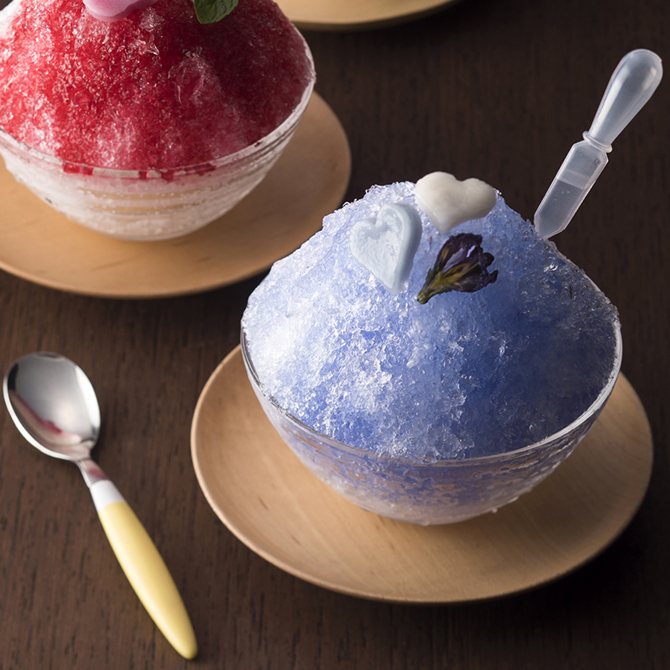 | ブルーハーブのかき氷 | バタフライピーシロップ+果汁入りレモンシロップ(別添え・かけると色が紫に変わります) *下地にシュガーシロップと練乳・コンデンスミルクをオススメ |