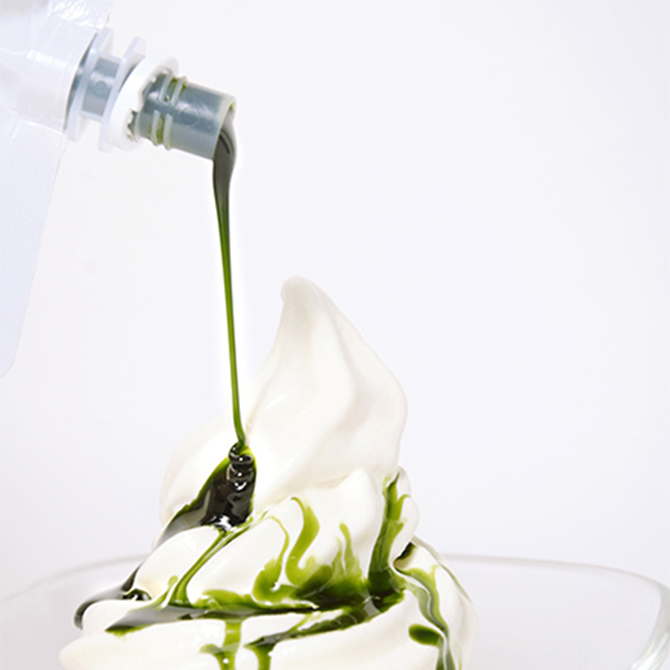 風味豊かな宇治抹茶を使用した濃厚タイプの蜜です。粘性が高くて濃度が濃いのでソースのように使え、宇治抹茶の深みと香りがかき氷に最適。菓子材料にもご利用いただけます