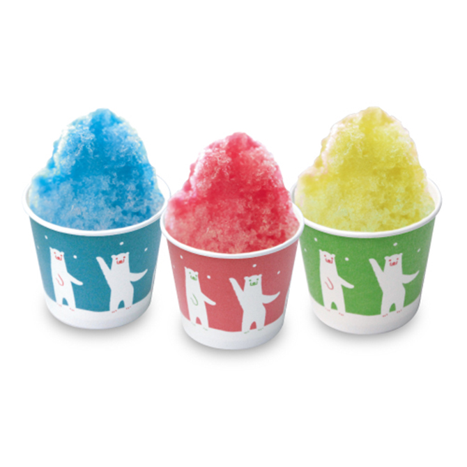 シロクマが踊る独特のデザインの紙カップ。発泡スチロール13オンスサイズとほぼ同じ容量のかき氷カップ