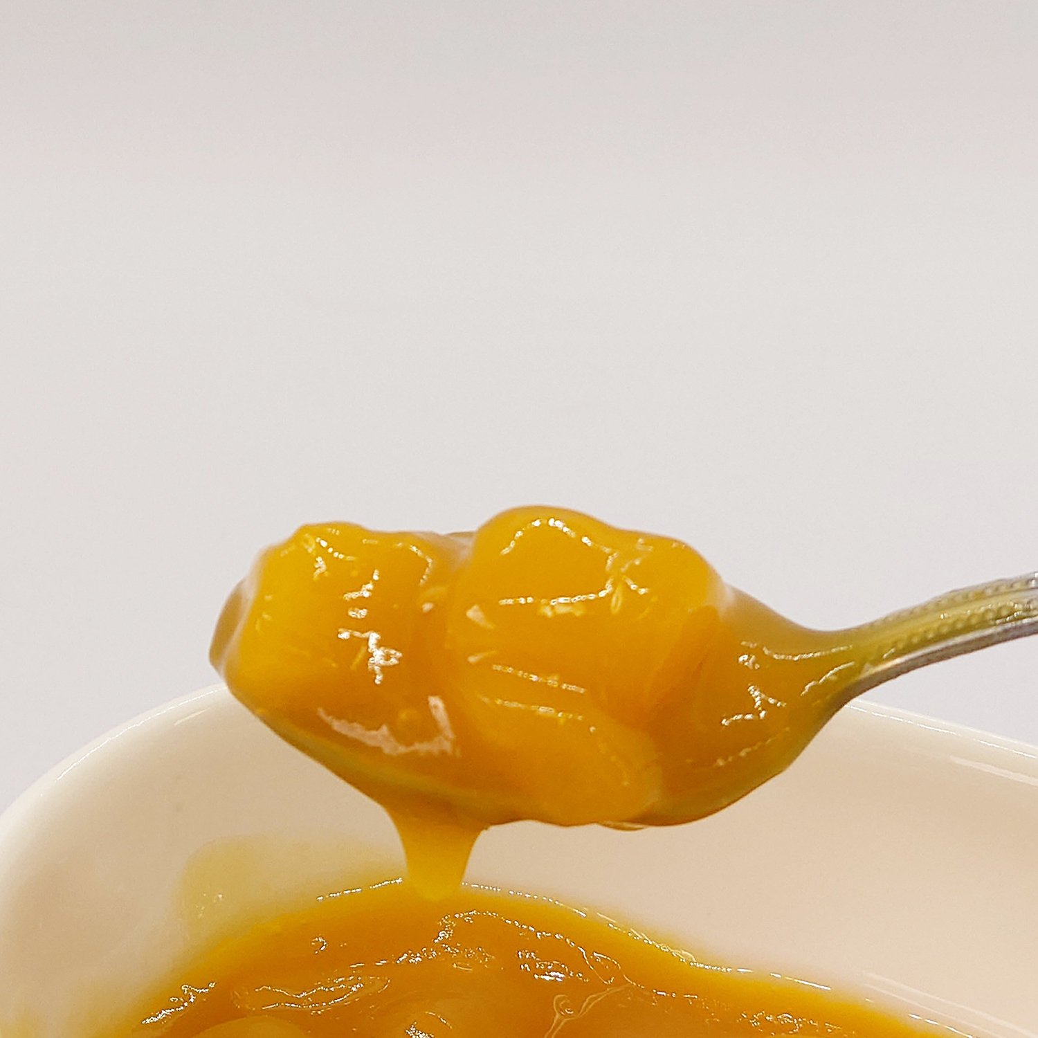2.「マンゴーシロップ」の中からティースプーン1杯程度の「マンゴー果肉」を別皿に取り分けておく
